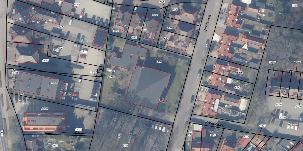 Het perceel waarop Smidsweg 20 staat heeft een oppervlakte van 2643 m². Dit is een zeer groot perceel. De perceeloppervlakte wordt geregistreerd door het Kadaster. Gedetailleerde informatie over de maten van dit perceel kunt u vinden in het rapport Kadastrale kaart met maatvoering van Smidsweg 20.