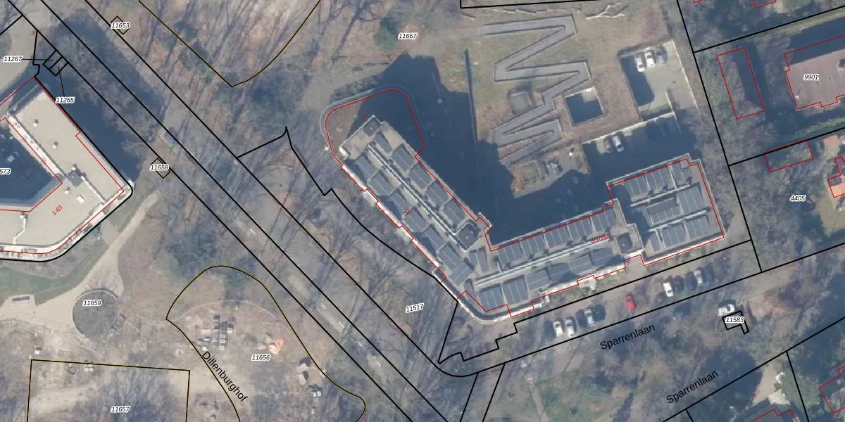 Het perceel waarop Sparrenlaan 10-12 staat heeft een oppervlakte van 9853 m². Dit is een zeer groot perceel. De perceeloppervlakte wordt geregistreerd door het Kadaster. Gedetailleerde informatie over de maten van dit perceel kunt u vinden in het rapport Kadastrale kaart met maatvoering van Sparrenlaan 10-12.