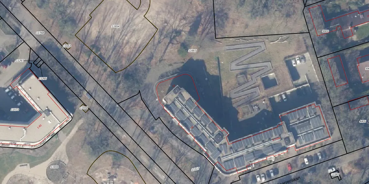 Het perceel waarop Sparrenlaan 10-31 staat heeft een oppervlakte van 9853 m². Dit is een zeer groot perceel. De perceeloppervlakte wordt geregistreerd door het Kadaster. Gedetailleerde informatie over de maten van dit perceel kunt u vinden in het rapport Kadastrale kaart met maatvoering van Sparrenlaan 10-31.