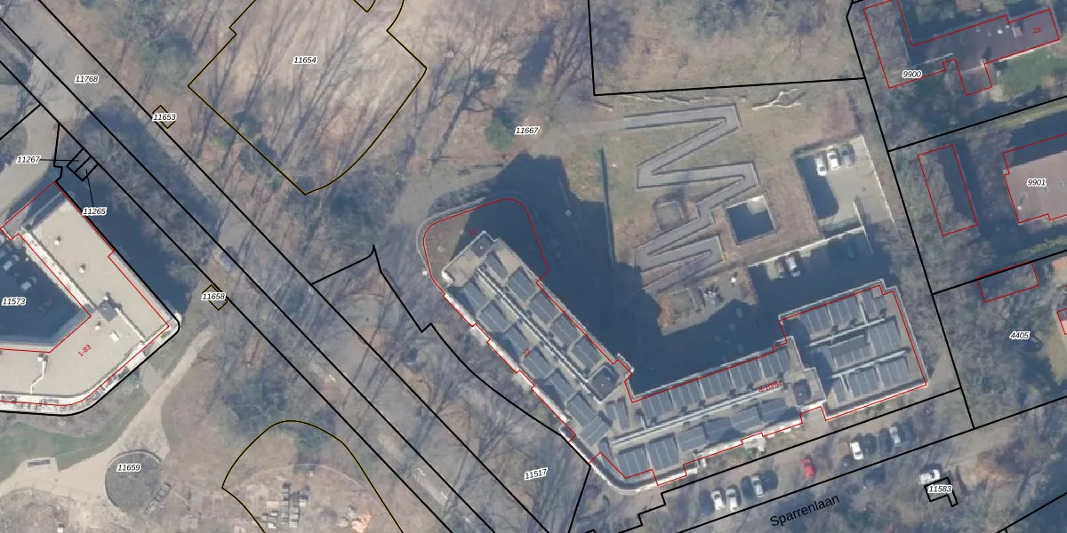Het perceel waarop Sparrenlaan 10-55 staat heeft een oppervlakte van 9853 m². Dit is een zeer groot perceel. De perceeloppervlakte wordt geregistreerd door het Kadaster. Gedetailleerde informatie over de maten van dit perceel kunt u vinden in het rapport Kadastrale kaart met maatvoering van Sparrenlaan 10-55.