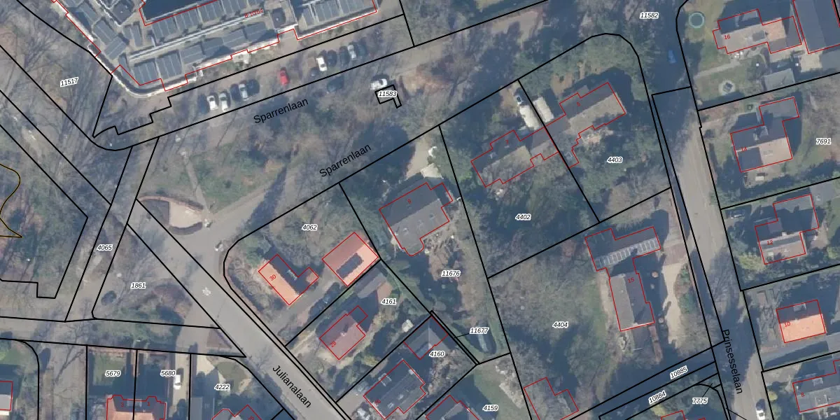 Sparrenlaan 9 is gelegen op kadastraal perceel EML00F11676. Deze kadastrale aanduiding is uniek en wordt gebruikt door het Kadaster om eigendomsrechten en andere zakelijke rechten vast te leggen. Het perceel maakt onderdeel uit van de kadastrale gemeente Ermelo.