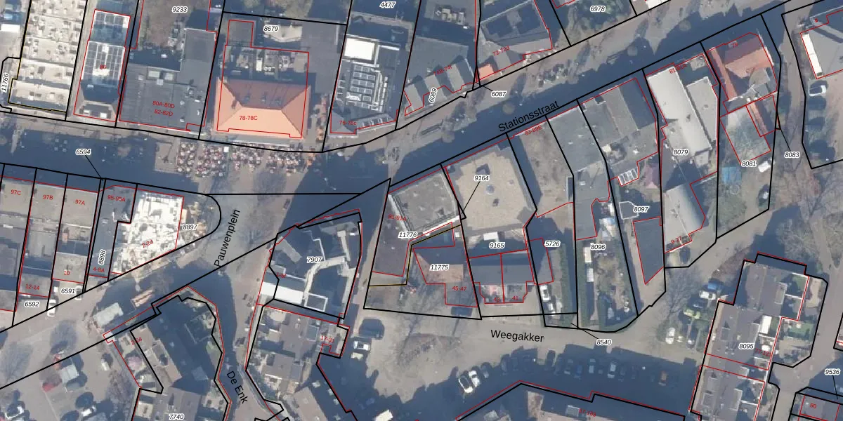 Het perceel waarop Stationsstraat 91-h staat heeft een oppervlakte van 341 m². Dit is een groot perceel. De perceeloppervlakte wordt geregistreerd door het Kadaster. Gedetailleerde informatie over de maten van dit perceel kunt u vinden in het rapport Kadastrale kaart met maatvoering van Stationsstraat 91-h.