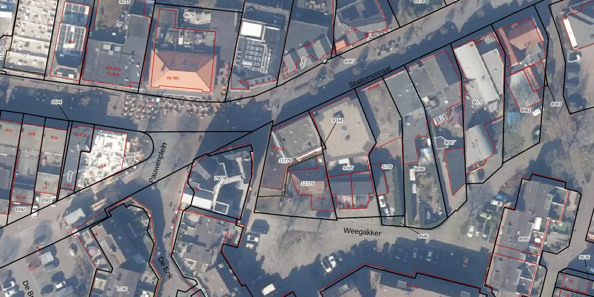 Het perceel waarop Stationsstraat 91-m staat heeft een oppervlakte van 341 m². Dit is een groot perceel. De perceeloppervlakte wordt geregistreerd door het Kadaster. Gedetailleerde informatie over de maten van dit perceel kunt u vinden in het rapport Kadastrale kaart met maatvoering van Stationsstraat 91-m.