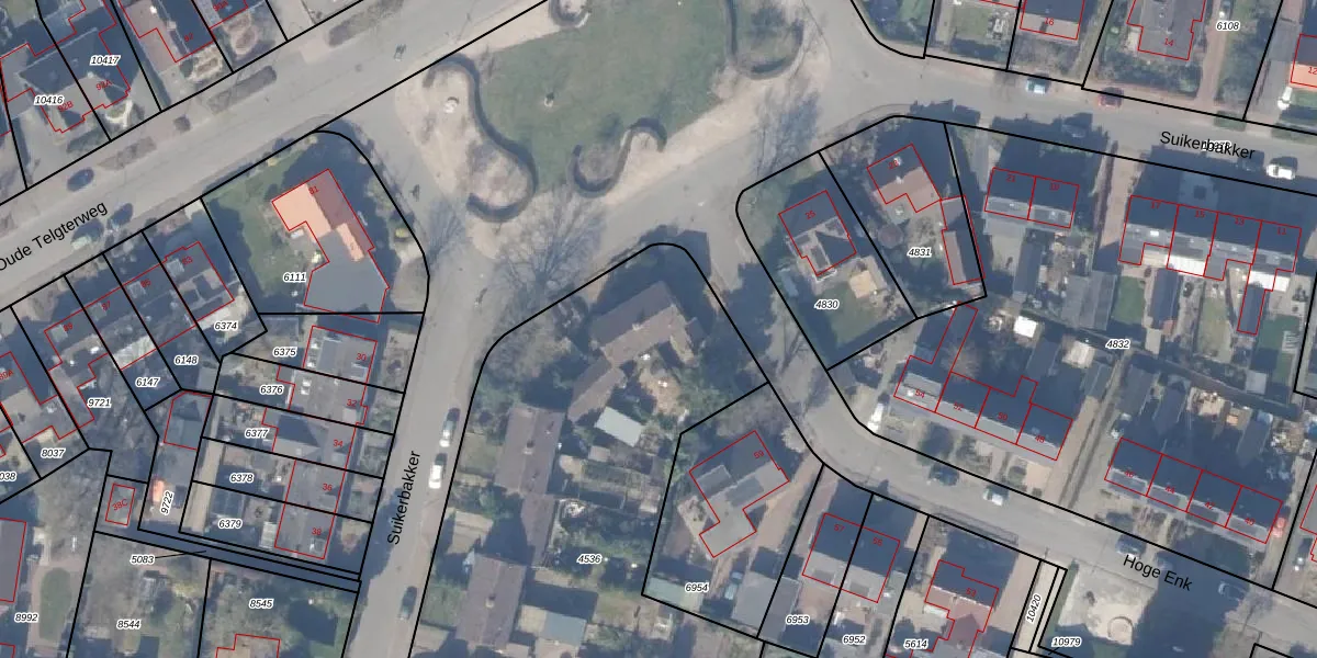 Het perceel waarop Suikerbakker 31 staat heeft een oppervlakte van 3710 m². Dit is een zeer groot perceel. De perceeloppervlakte wordt geregistreerd door het Kadaster. Gedetailleerde informatie over de maten van dit perceel kunt u vinden in het rapport Kadastrale kaart met maatvoering van Suikerbakker 31.