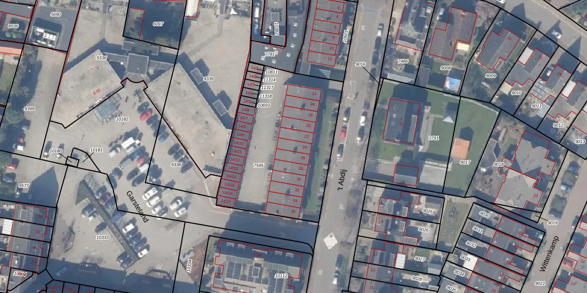 Het perceel waarop 't Abdij 24 staat heeft een oppervlakte van 1633 m². Dit is een zeer groot perceel. De perceeloppervlakte wordt geregistreerd door het Kadaster. Gedetailleerde informatie over de maten van dit perceel kunt u vinden in het rapport Kadastrale kaart met maatvoering van 't Abdij 24.
