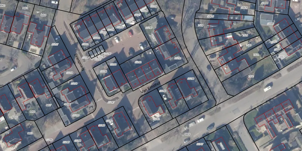 Het perceel waarop Van Emsthof 30 staat heeft een oppervlakte van 474 m². Dit is een groot perceel. De perceeloppervlakte wordt geregistreerd door het Kadaster. Gedetailleerde informatie over de maten van dit perceel kunt u vinden in het rapport Kadastrale kaart met maatvoering van Van Emsthof 30.