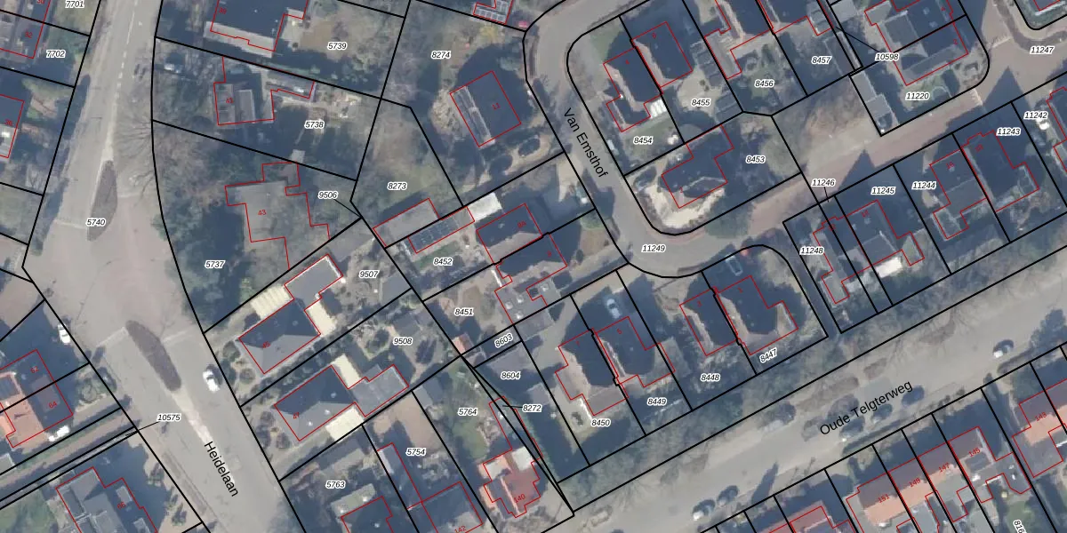 Het perceel waarop Van Emsthof 9 staat heeft een oppervlakte van 435 m². Dit is een groot perceel. De perceeloppervlakte wordt geregistreerd door het Kadaster. Gedetailleerde informatie over de maten van dit perceel kunt u vinden in het rapport Kadastrale kaart met maatvoering van Van Emsthof 9.