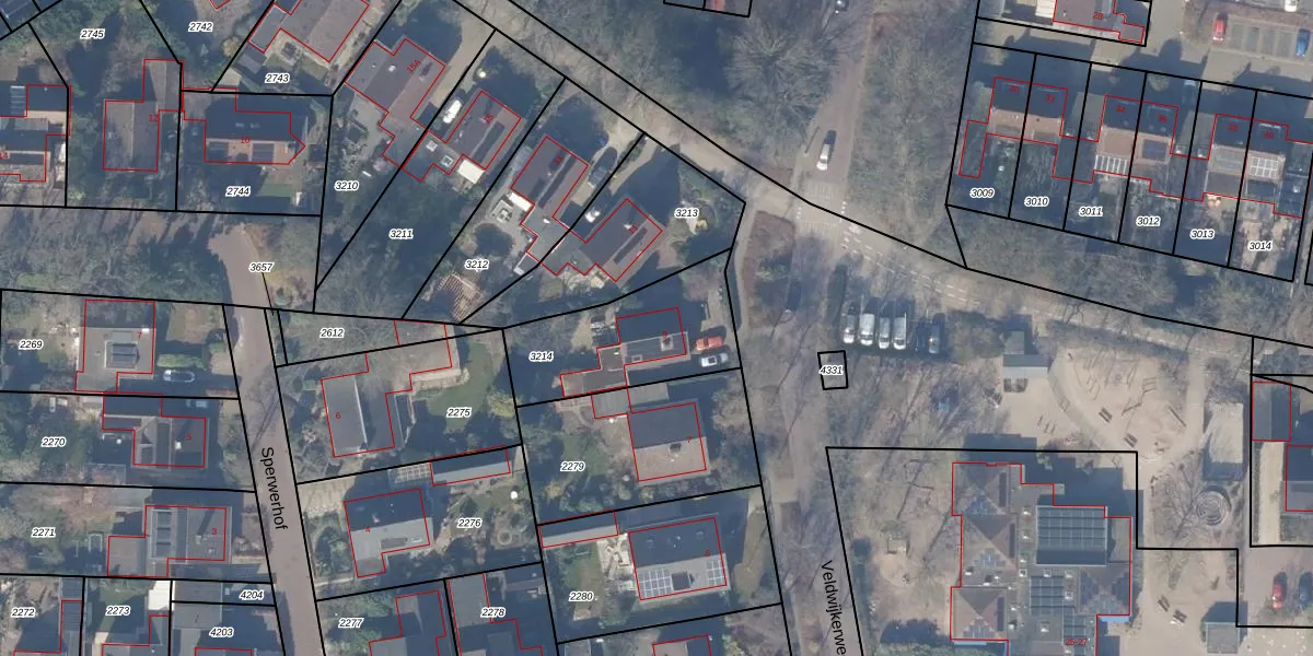 Veldwijkerweg 9 is gelegen op kadastraal perceel EML00G3214. Deze kadastrale aanduiding is uniek en wordt gebruikt door het Kadaster om eigendomsrechten en andere zakelijke rechten vast te leggen. Het perceel maakt onderdeel uit van de kadastrale gemeente Ermelo.