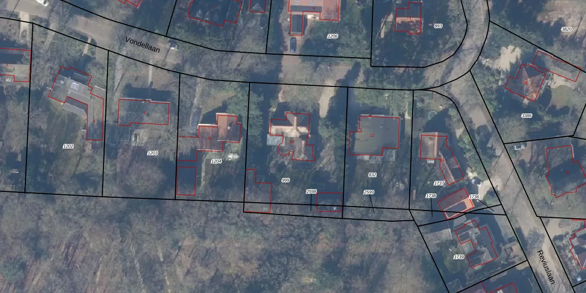 Het perceel waarop Vondellaan 10 staat heeft een oppervlakte van 1373 m². Dit is een zeer groot perceel. De perceeloppervlakte wordt geregistreerd door het Kadaster. Gedetailleerde informatie over de maten van dit perceel kunt u vinden in het rapport Kadastrale kaart met maatvoering van Vondellaan 10.