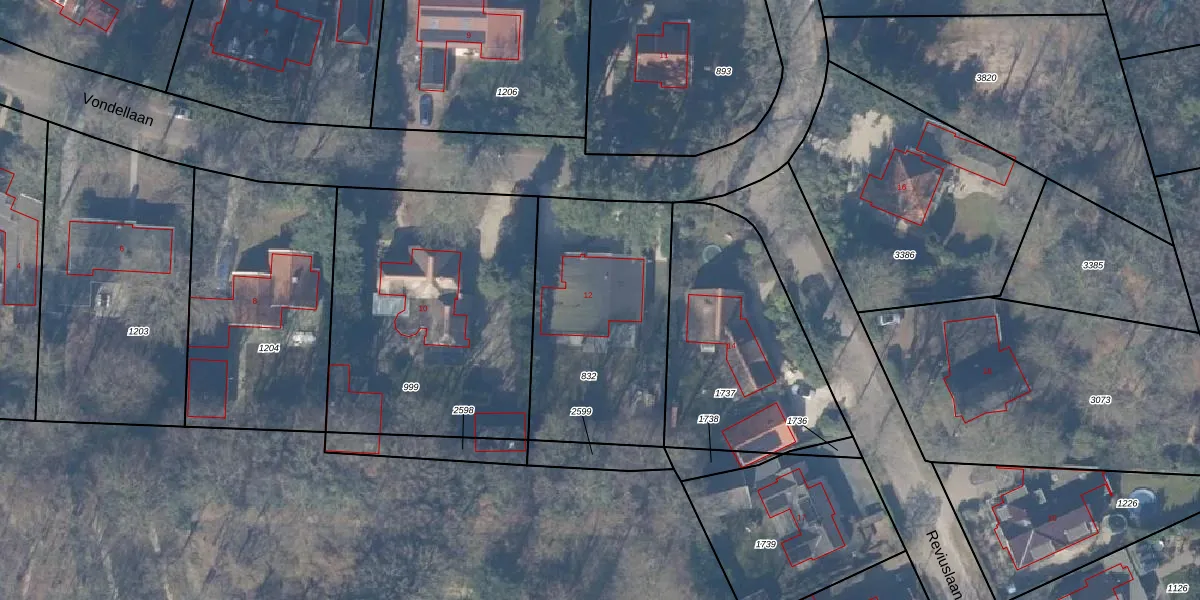 Het perceel waarop Vondellaan 12 staat heeft een oppervlakte van 919 m². Dit is een groot perceel. De perceeloppervlakte wordt geregistreerd door het Kadaster. Gedetailleerde informatie over de maten van dit perceel kunt u vinden in het rapport Kadastrale kaart met maatvoering van Vondellaan 12.