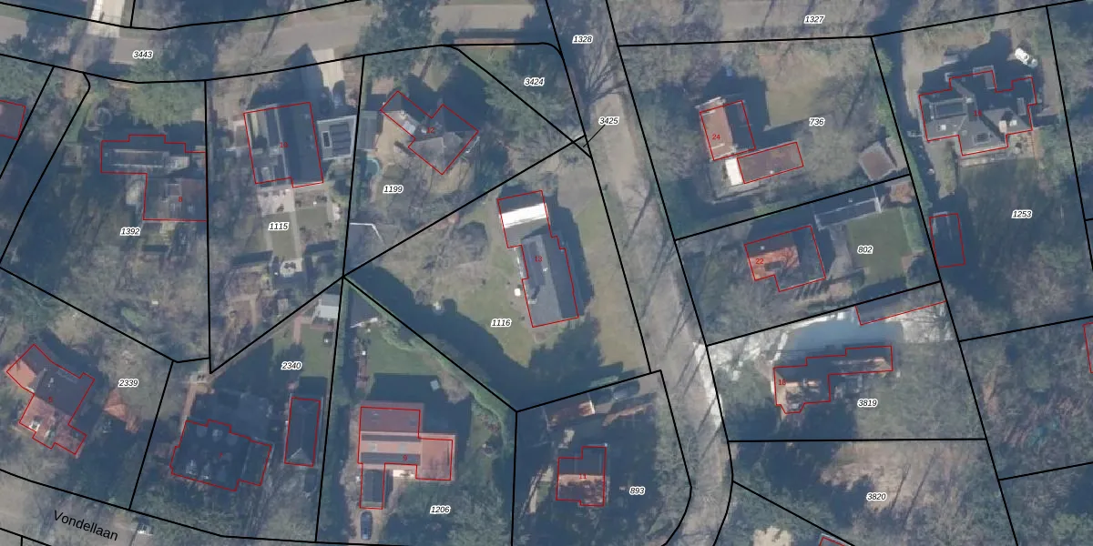 Het perceel waarop Vondellaan 13 staat heeft een oppervlakte van 1536 m². Dit is een zeer groot perceel. De perceeloppervlakte wordt geregistreerd door het Kadaster. Gedetailleerde informatie over de maten van dit perceel kunt u vinden in het rapport Kadastrale kaart met maatvoering van Vondellaan 13.