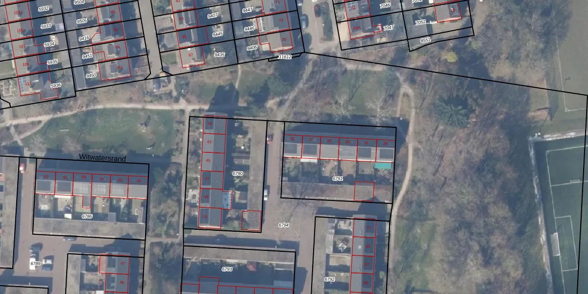 Het perceel waarop Witwatersrand 39 staat heeft een oppervlakte van 992 m². Dit is een groot perceel. De perceeloppervlakte wordt geregistreerd door het Kadaster. Gedetailleerde informatie over de maten van dit perceel kunt u vinden in het rapport Kadastrale kaart met maatvoering van Witwatersrand 39.