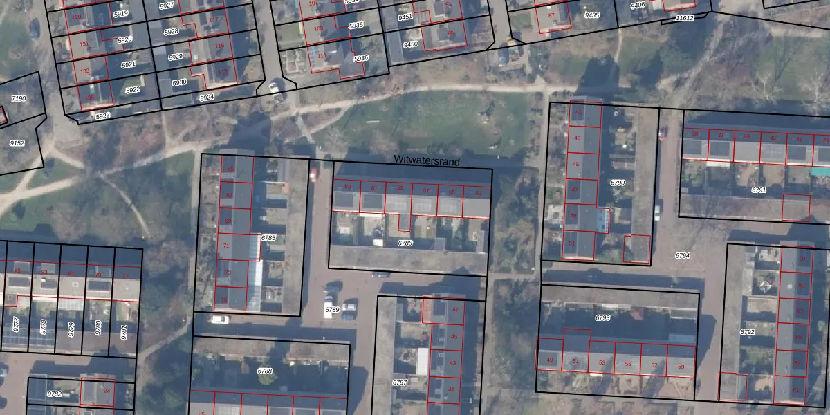 Het perceel waarop Witwatersrand 57 staat heeft een oppervlakte van 990 m². Dit is een groot perceel. De perceeloppervlakte wordt geregistreerd door het Kadaster. Gedetailleerde informatie over de maten van dit perceel kunt u vinden in het rapport Kadastrale kaart met maatvoering van Witwatersrand 57.