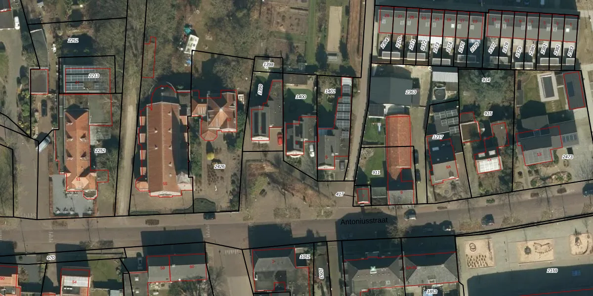 Antoniusstraat 3 is gelegen op kadastraal perceel ERP00P1400. Deze kadastrale aanduiding is uniek en wordt gebruikt door het Kadaster om eigendomsrechten en andere zakelijke rechten vast te leggen. Het perceel maakt onderdeel uit van de kadastrale gemeente Erp.