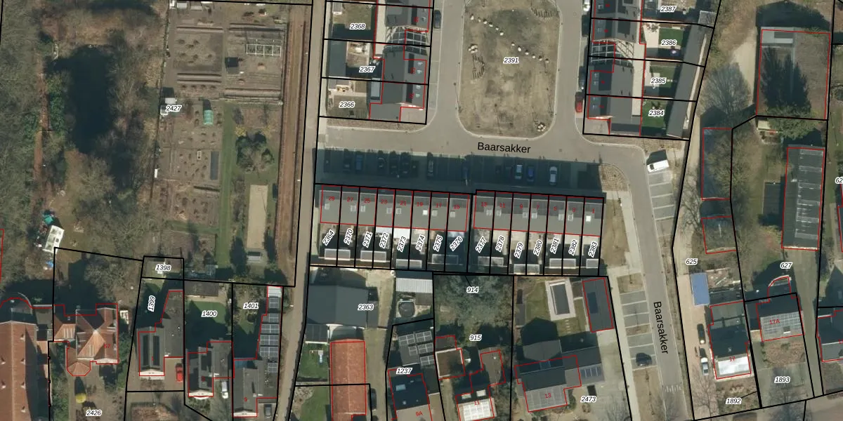 Baarsakker 19 is gelegen op kadastraal perceel ERP00P2374. Deze kadastrale aanduiding is uniek en wordt gebruikt door het Kadaster om eigendomsrechten en andere zakelijke rechten vast te leggen. Het perceel maakt onderdeel uit van de kadastrale gemeente Erp.