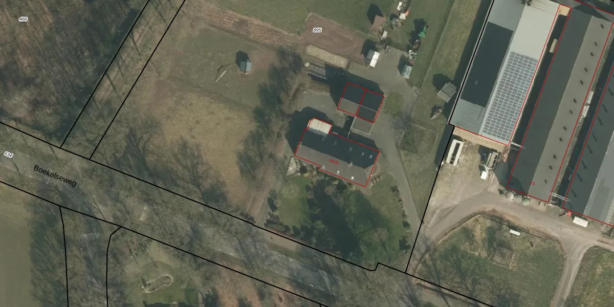 Boekelseweg 19 is gelegen op kadastraal perceel ERP00R895. Deze kadastrale aanduiding is uniek en wordt gebruikt door het Kadaster om eigendomsrechten en andere zakelijke rechten vast te leggen. Het perceel maakt onderdeel uit van de kadastrale gemeente Erp.