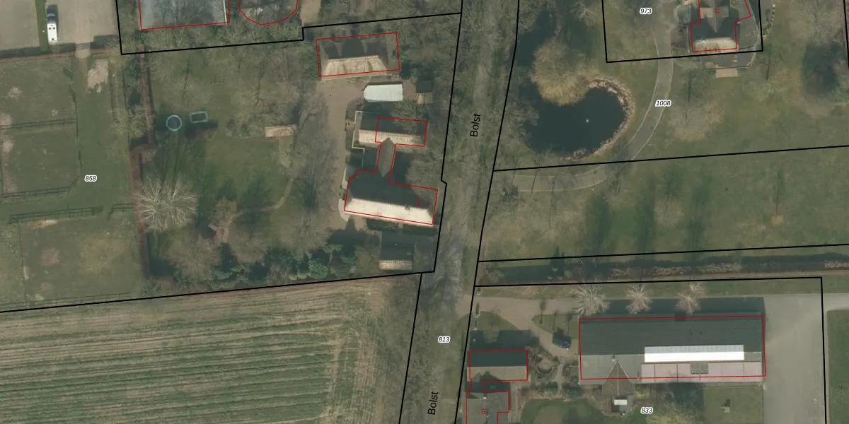Het perceel waarop Bolst 13 staat heeft een oppervlakte van 1,1 ha. Dit is een zeer groot perceel. De perceeloppervlakte wordt geregistreerd door het Kadaster. Gedetailleerde informatie over de maten van dit perceel kunt u vinden in het rapport Kadastrale kaart met maatvoering van Bolst 13.