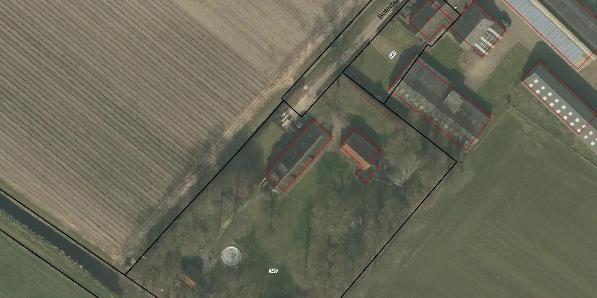 Het perceel waarop Boterhurken 22 staat heeft een oppervlakte van 5440 m². Dit is een zeer groot perceel. De perceeloppervlakte wordt geregistreerd door het Kadaster. Gedetailleerde informatie over de maten van dit perceel kunt u vinden in het rapport Kadastrale kaart met maatvoering van Boterhurken 22.