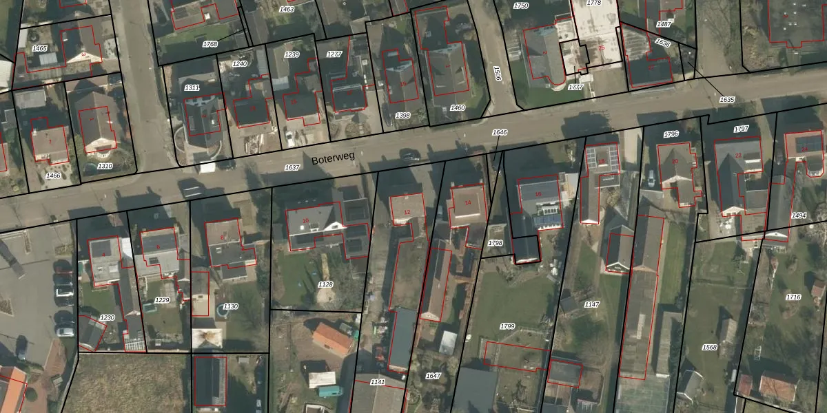 Boterweg 12 is gelegen op kadastraal perceel ERP00E1141. Deze kadastrale aanduiding is uniek en wordt gebruikt door het Kadaster om eigendomsrechten en andere zakelijke rechten vast te leggen. Het perceel maakt onderdeel uit van de kadastrale gemeente Erp.
