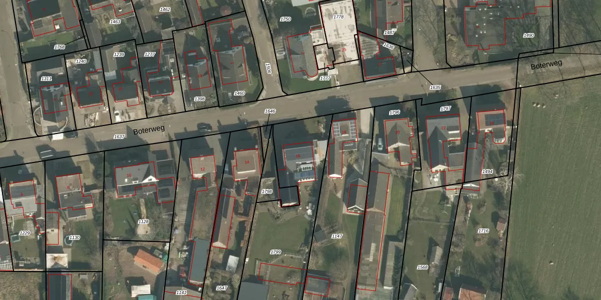 Boterweg 16 is gelegen op kadastraal perceel ERP00E1799. Deze kadastrale aanduiding is uniek en wordt gebruikt door het Kadaster om eigendomsrechten en andere zakelijke rechten vast te leggen. Het perceel maakt onderdeel uit van de kadastrale gemeente Erp.