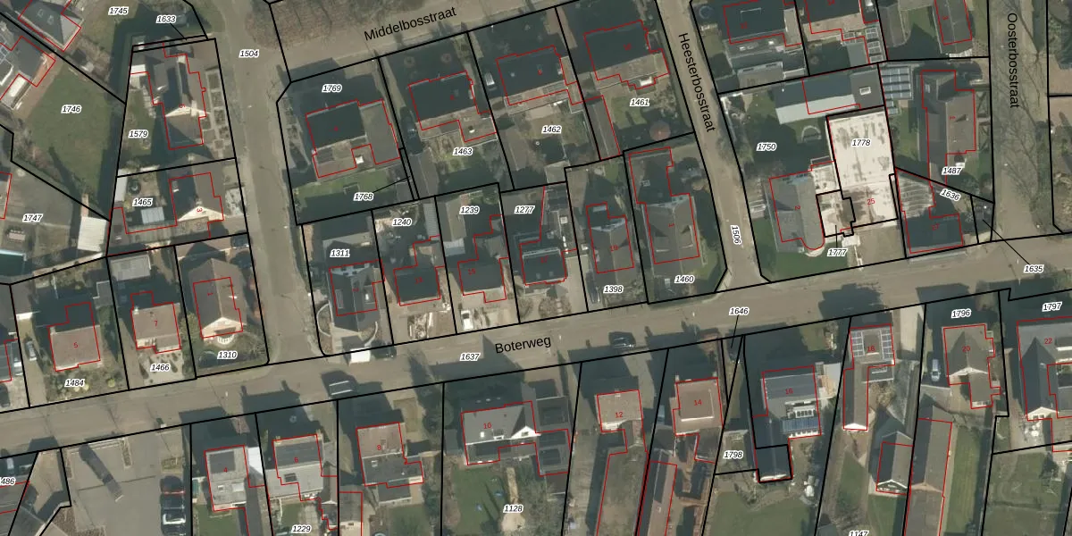 Boterweg 17 is gelegen op kadastraal perceel ERP00E1277. Deze kadastrale aanduiding is uniek en wordt gebruikt door het Kadaster om eigendomsrechten en andere zakelijke rechten vast te leggen. Het perceel maakt onderdeel uit van de kadastrale gemeente Erp.
