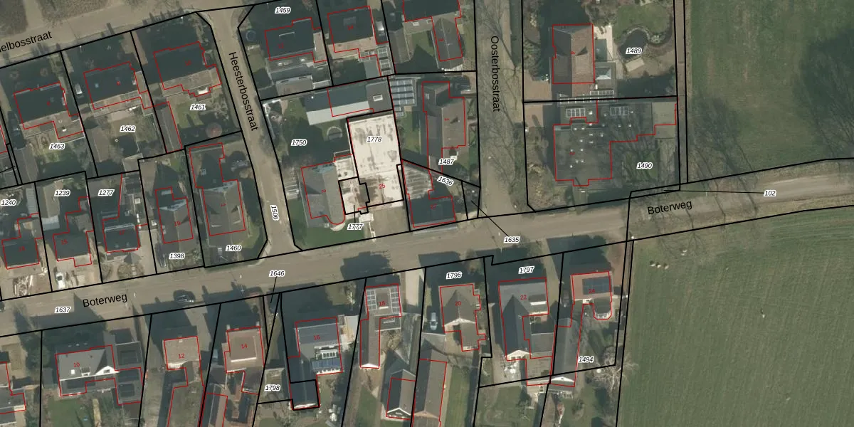 Boterweg 27 is gelegen op kadastraal perceel ERP00E1636. Deze kadastrale aanduiding is uniek en wordt gebruikt door het Kadaster om eigendomsrechten en andere zakelijke rechten vast te leggen. Het perceel maakt onderdeel uit van de kadastrale gemeente Erp.