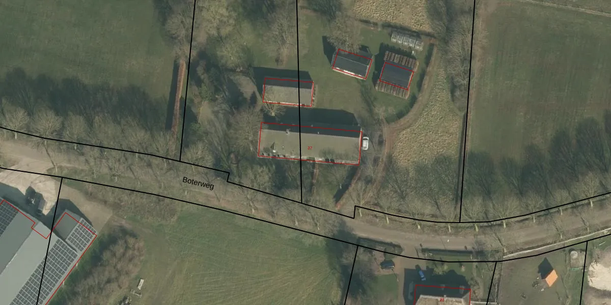 Boterweg 37 is gelegen op kadastraal perceel ERP00S1263. Deze kadastrale aanduiding is uniek en wordt gebruikt door het Kadaster om eigendomsrechten en andere zakelijke rechten vast te leggen. Het perceel maakt onderdeel uit van de kadastrale gemeente Erp.