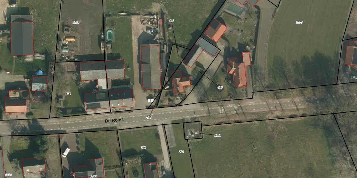 De Roost 9 is gelegen op kadastraal perceel ERP00P604. Deze kadastrale aanduiding is uniek en wordt gebruikt door het Kadaster om eigendomsrechten en andere zakelijke rechten vast te leggen. Het perceel maakt onderdeel uit van de kadastrale gemeente Erp.