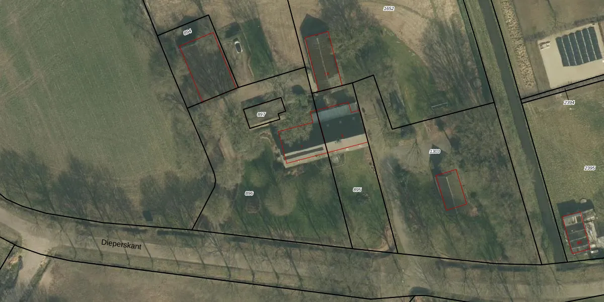 Het perceel waarop Dieperskant 7 staat heeft een oppervlakte van 2110 m². Dit is een zeer groot perceel. De perceeloppervlakte wordt geregistreerd door het Kadaster. Gedetailleerde informatie over de maten van dit perceel kunt u vinden in het rapport Kadastrale kaart met maatvoering van Dieperskant 7.