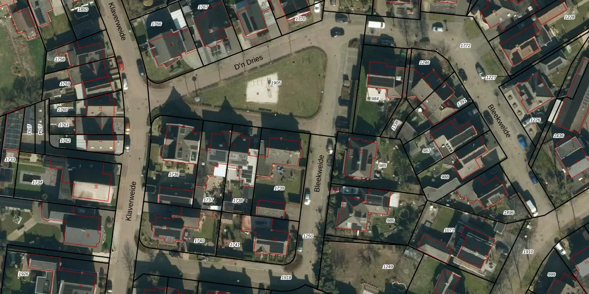 Het perceel waarop D'n Dries 1 staat heeft een oppervlakte van 501 m². Dit is een groot perceel. De perceeloppervlakte wordt geregistreerd door het Kadaster. Gedetailleerde informatie over de maten van dit perceel kunt u vinden in het rapport Kadastrale kaart met maatvoering van D'n Dries 1.