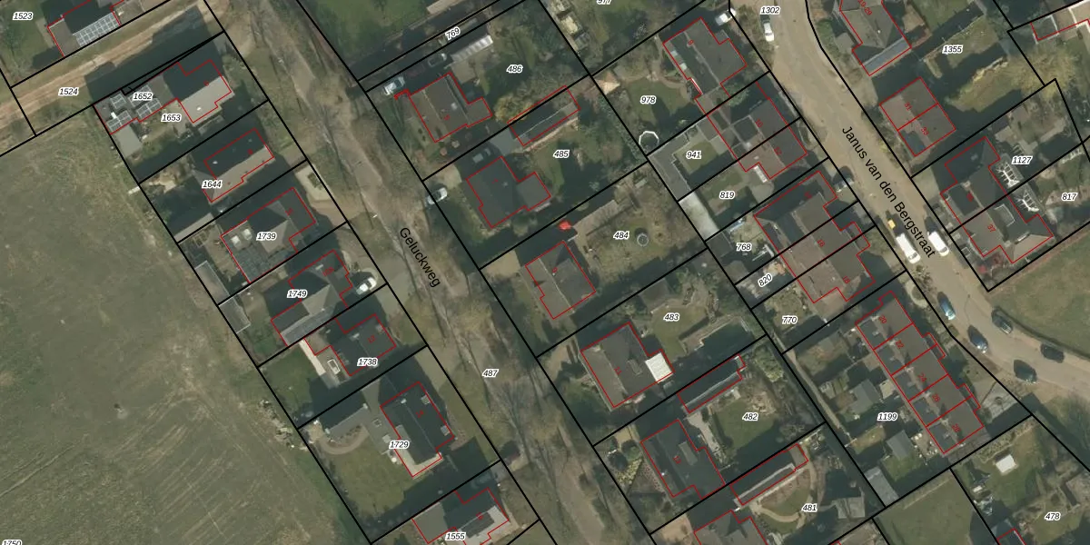 Geluckweg 9 is gelegen op kadastraal perceel ERP00S484. Deze kadastrale aanduiding is uniek en wordt gebruikt door het Kadaster om eigendomsrechten en andere zakelijke rechten vast te leggen. Het perceel maakt onderdeel uit van de kadastrale gemeente Erp.