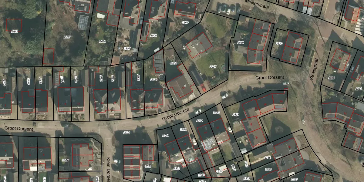 Groot Dorsent 21 is gelegen op kadastraal perceel ERP00M2630. Deze kadastrale aanduiding is uniek en wordt gebruikt door het Kadaster om eigendomsrechten en andere zakelijke rechten vast te leggen. Het perceel maakt onderdeel uit van de kadastrale gemeente Erp.