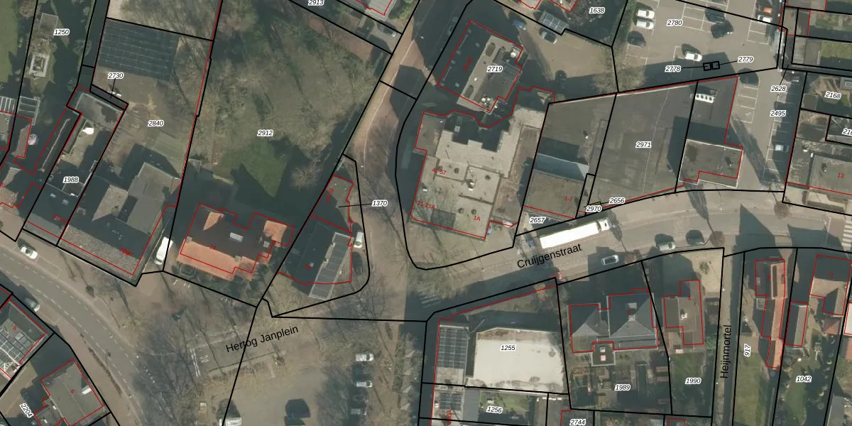Hertog Janplein 21 is gelegen op kadastraal perceel ERP00M2719. Deze kadastrale aanduiding is uniek en wordt gebruikt door het Kadaster om eigendomsrechten en andere zakelijke rechten vast te leggen. Het perceel maakt onderdeel uit van de kadastrale gemeente Erp.
