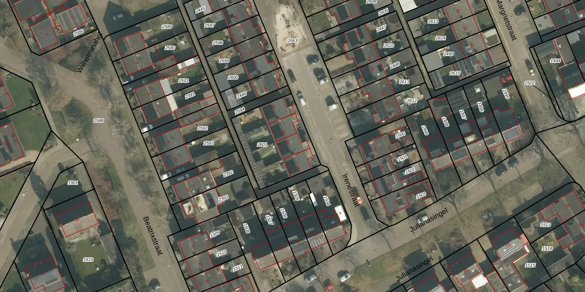 Het perceel waarop Irenestraat 32 staat heeft een oppervlakte van 595 m². Dit is een groot perceel. De perceeloppervlakte wordt geregistreerd door het Kadaster. Gedetailleerde informatie over de maten van dit perceel kunt u vinden in het rapport Kadastrale kaart met maatvoering van Irenestraat 32.