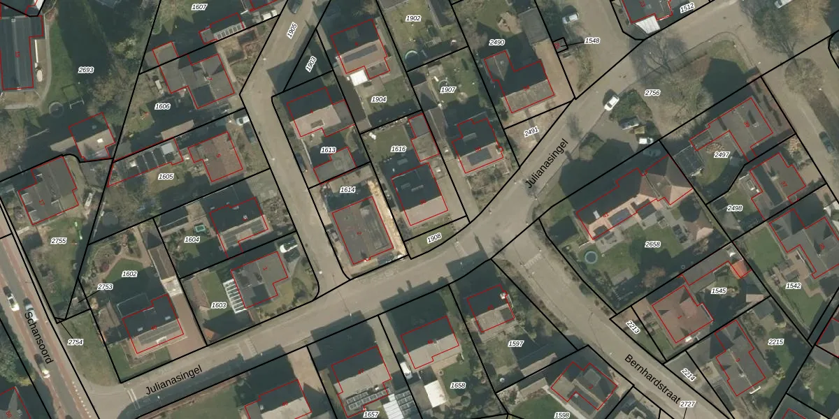 Julianasingel 38 is gelegen op kadastraal perceel ERP00M1616. Deze kadastrale aanduiding is uniek en wordt gebruikt door het Kadaster om eigendomsrechten en andere zakelijke rechten vast te leggen. Het perceel maakt onderdeel uit van de kadastrale gemeente Erp.