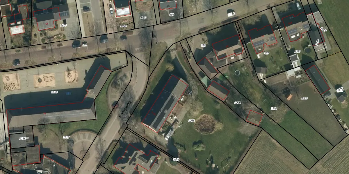 Kampweg 1 is gelegen op kadastraal perceel ERP00P2246. Deze kadastrale aanduiding is uniek en wordt gebruikt door het Kadaster om eigendomsrechten en andere zakelijke rechten vast te leggen. Het perceel maakt onderdeel uit van de kadastrale gemeente Erp.