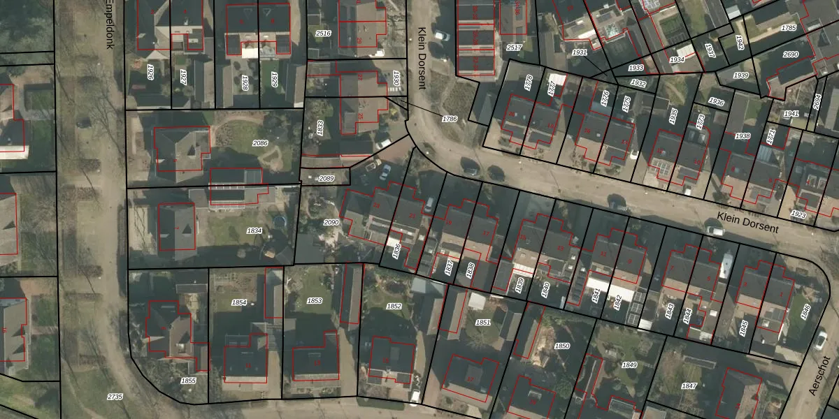 Klein Dorsent 21 is gelegen op kadastraal perceel ERP00M1836. Deze kadastrale aanduiding is uniek en wordt gebruikt door het Kadaster om eigendomsrechten en andere zakelijke rechten vast te leggen. Het perceel maakt onderdeel uit van de kadastrale gemeente Erp.