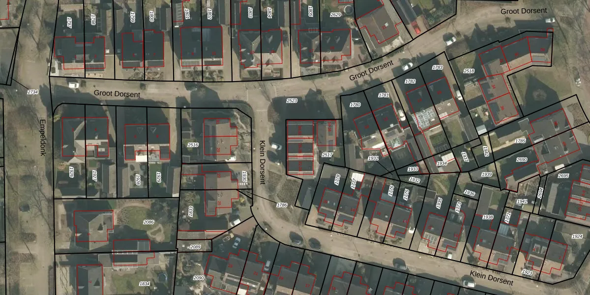Het perceel waarop Klein Dorsent 24 staat heeft een oppervlakte van 410 m². Dit is een groot perceel. De perceeloppervlakte wordt geregistreerd door het Kadaster. Gedetailleerde informatie over de maten van dit perceel kunt u vinden in het rapport Kadastrale kaart met maatvoering van Klein Dorsent 24.