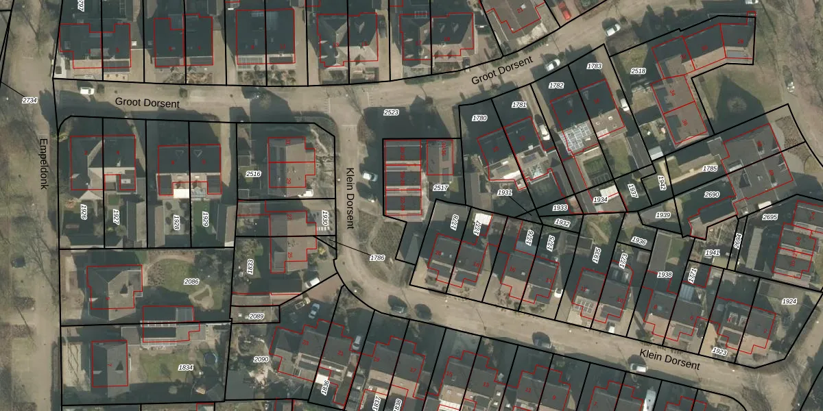 Het perceel waarop Klein Dorsent 30 staat heeft een oppervlakte van 410 m². Dit is een groot perceel. De perceeloppervlakte wordt geregistreerd door het Kadaster. Gedetailleerde informatie over de maten van dit perceel kunt u vinden in het rapport Kadastrale kaart met maatvoering van Klein Dorsent 30.