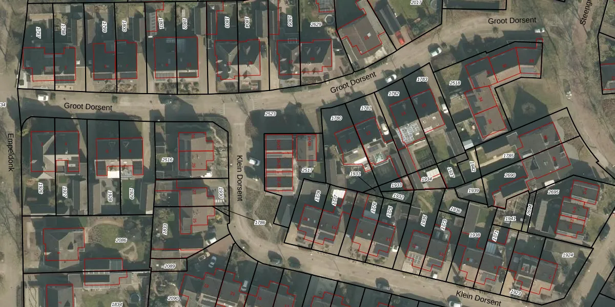 Het perceel waarop Klein Dorsent 36 staat heeft een oppervlakte van 410 m². Dit is een groot perceel. De perceeloppervlakte wordt geregistreerd door het Kadaster. Gedetailleerde informatie over de maten van dit perceel kunt u vinden in het rapport Kadastrale kaart met maatvoering van Klein Dorsent 36.