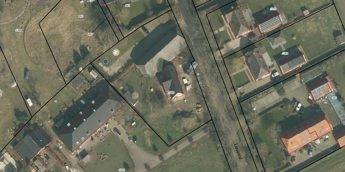 Looieind 14 is gelegen op kadastraal perceel ERP00R1800. Deze kadastrale aanduiding is uniek en wordt gebruikt door het Kadaster om eigendomsrechten en andere zakelijke rechten vast te leggen. Het perceel maakt onderdeel uit van de kadastrale gemeente Erp.