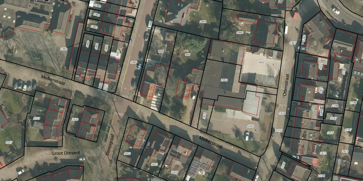 Melkerstraat 13 is gelegen op kadastraal perceel ERP00M895. Deze kadastrale aanduiding is uniek en wordt gebruikt door het Kadaster om eigendomsrechten en andere zakelijke rechten vast te leggen. Het perceel maakt onderdeel uit van de kadastrale gemeente Erp.