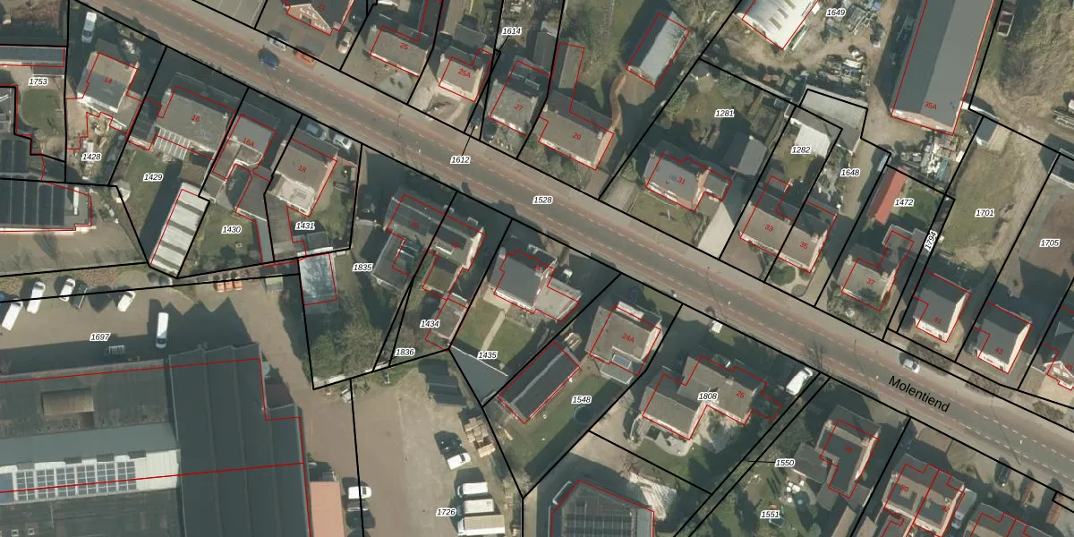Het perceel waarop Molentiend 24 staat heeft een oppervlakte van 530 m². Dit is een groot perceel. De perceeloppervlakte wordt geregistreerd door het Kadaster. Gedetailleerde informatie over de maten van dit perceel kunt u vinden in het rapport Kadastrale kaart met maatvoering van Molentiend 24.