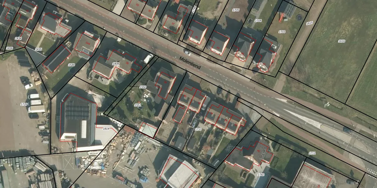 Het perceel waarop Molentiend 30 staat heeft een oppervlakte van 1640 m². Dit is een zeer groot perceel. De perceeloppervlakte wordt geregistreerd door het Kadaster. Gedetailleerde informatie over de maten van dit perceel kunt u vinden in het rapport Kadastrale kaart met maatvoering van Molentiend 30.