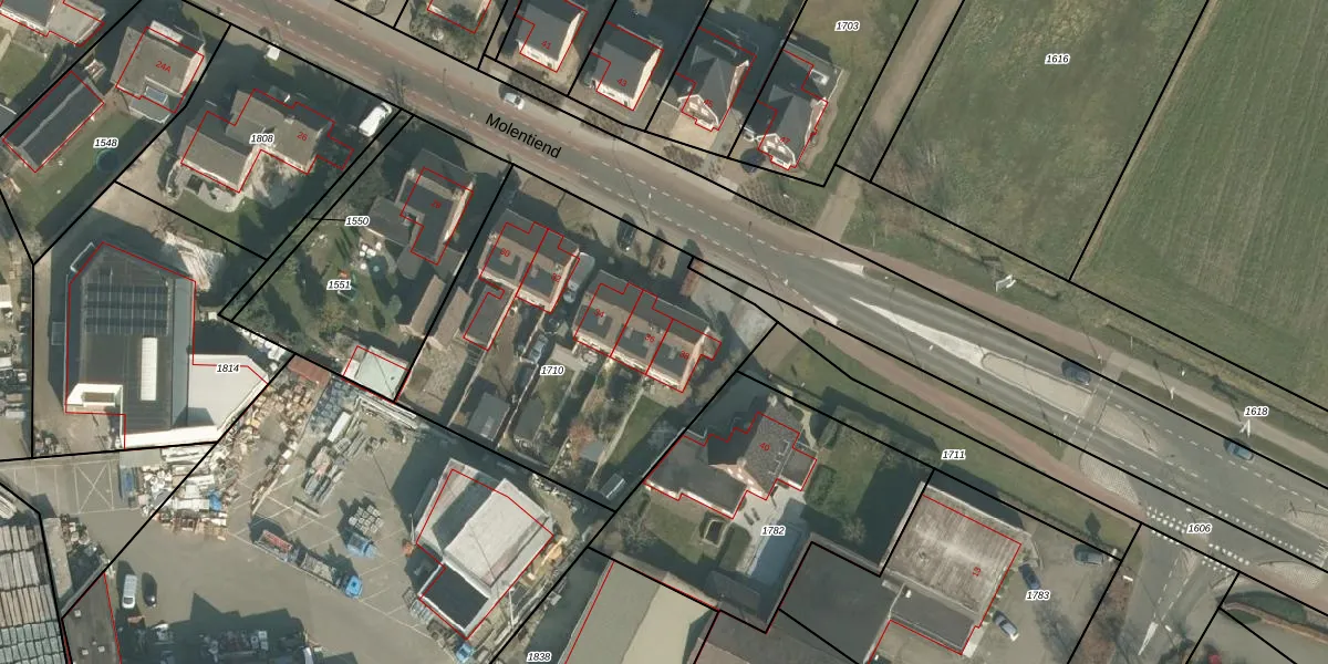 Het perceel waarop Molentiend 36 staat heeft een oppervlakte van 1640 m². Dit is een zeer groot perceel. De perceeloppervlakte wordt geregistreerd door het Kadaster. Gedetailleerde informatie over de maten van dit perceel kunt u vinden in het rapport Kadastrale kaart met maatvoering van Molentiend 36.