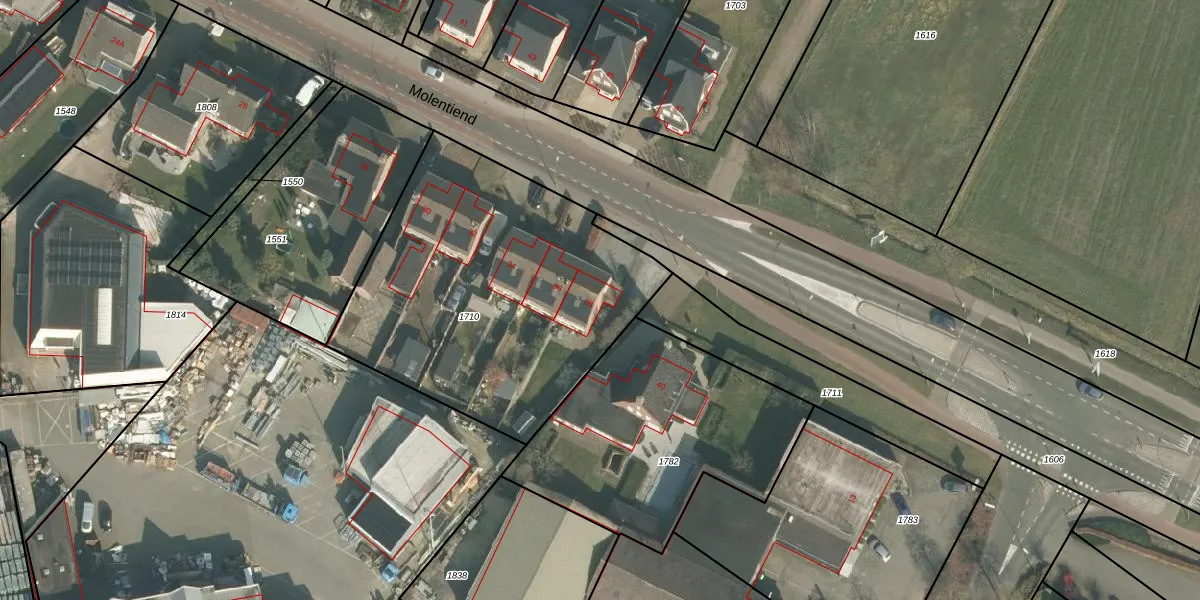 Het perceel waarop Molentiend 38 staat heeft een oppervlakte van 1640 m². Dit is een zeer groot perceel. De perceeloppervlakte wordt geregistreerd door het Kadaster. Gedetailleerde informatie over de maten van dit perceel kunt u vinden in het rapport Kadastrale kaart met maatvoering van Molentiend 38.
