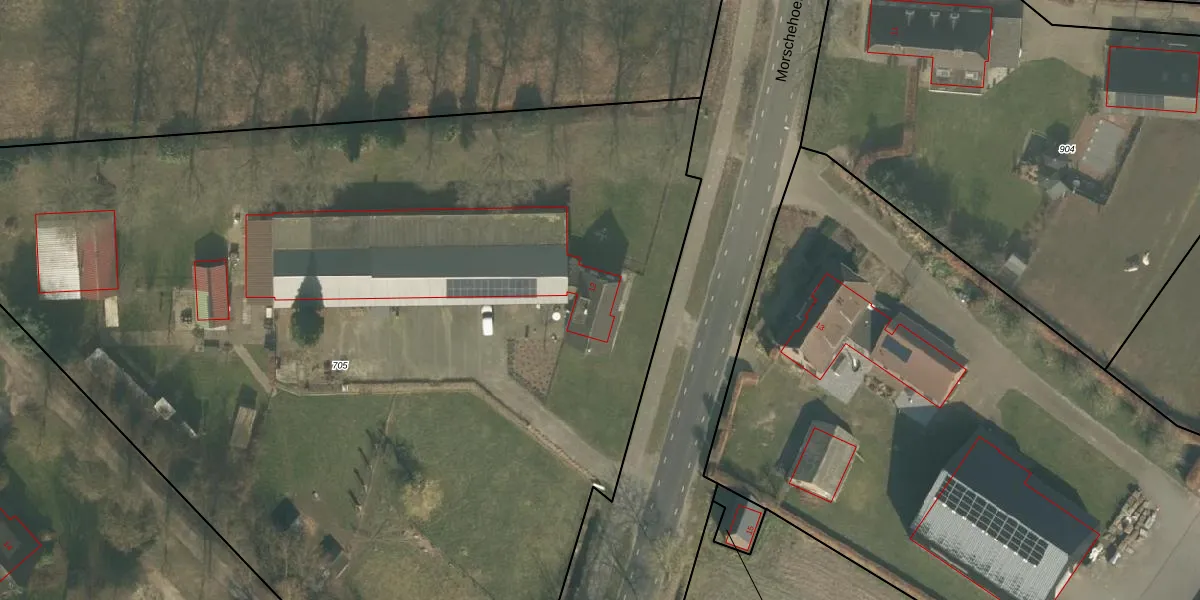 Morschehoef 12 is gelegen op kadastraal perceel ERP00R705. Deze kadastrale aanduiding is uniek en wordt gebruikt door het Kadaster om eigendomsrechten en andere zakelijke rechten vast te leggen. Het perceel maakt onderdeel uit van de kadastrale gemeente Erp.
