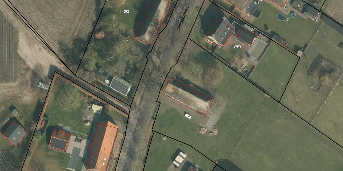 Het perceel waarop Morschehoef 19 staat heeft een oppervlakte van 3,5 ha. Dit is een zeer groot perceel. De perceeloppervlakte wordt geregistreerd door het Kadaster. Gedetailleerde informatie over de maten van dit perceel kunt u vinden in het rapport Kadastrale kaart met maatvoering van Morschehoef 19.