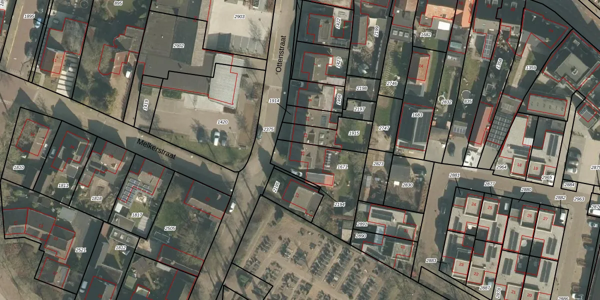 Het perceel waarop Ottenstraat 15 staat heeft een oppervlakte van 571 m². Dit is een groot perceel. De perceeloppervlakte wordt geregistreerd door het Kadaster. Gedetailleerde informatie over de maten van dit perceel kunt u vinden in het rapport Kadastrale kaart met maatvoering van Ottenstraat 15.
