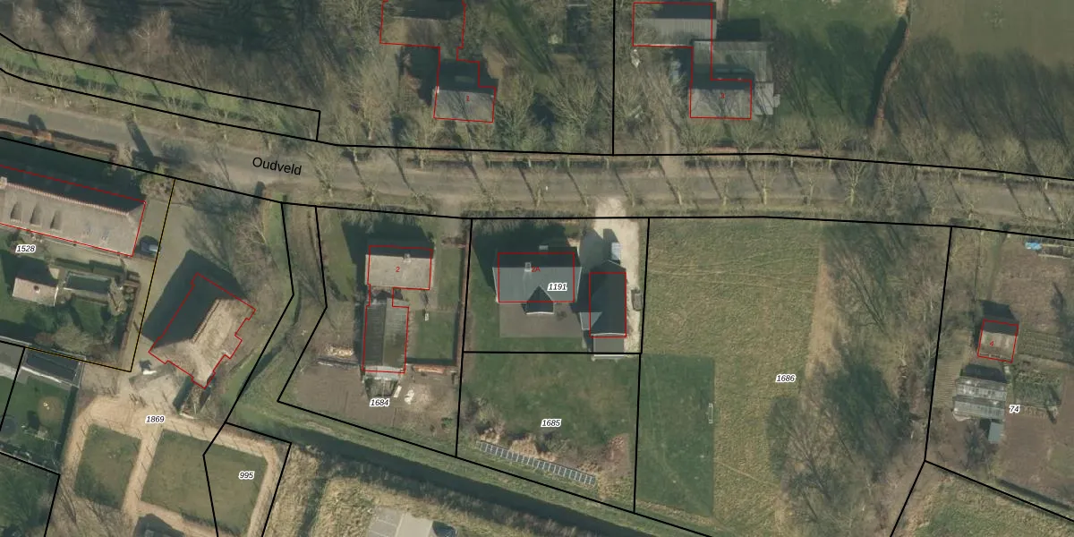 Het perceel waarop Oudveld 2-A staat heeft een oppervlakte van 830 m². Dit is een groot perceel. De perceeloppervlakte wordt geregistreerd door het Kadaster. Gedetailleerde informatie over de maten van dit perceel kunt u vinden in het rapport Kadastrale kaart met maatvoering van Oudveld 2-A.